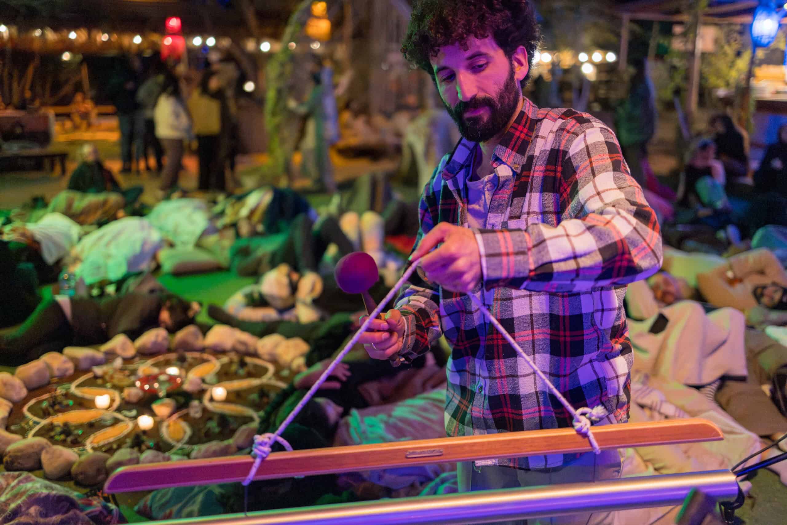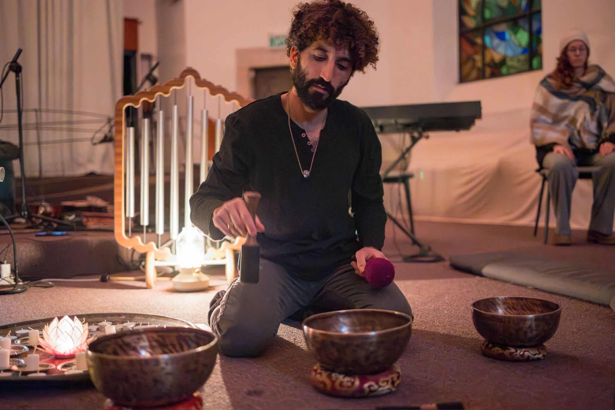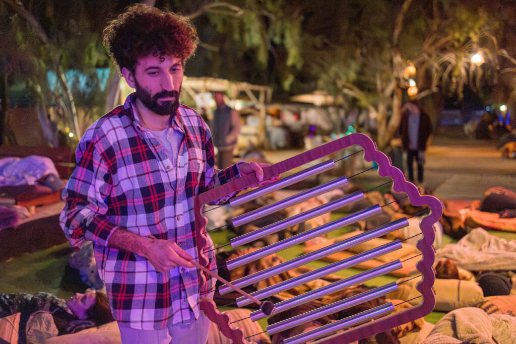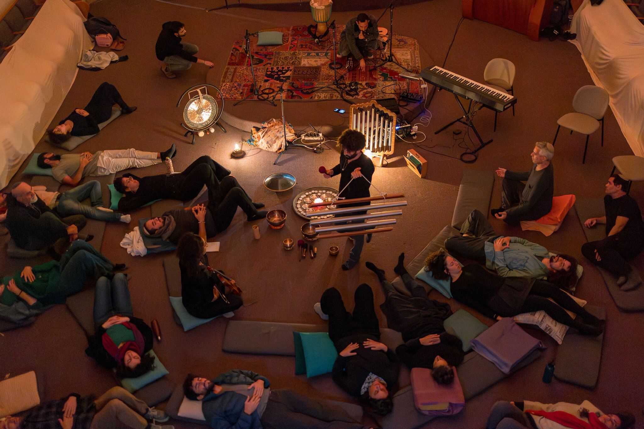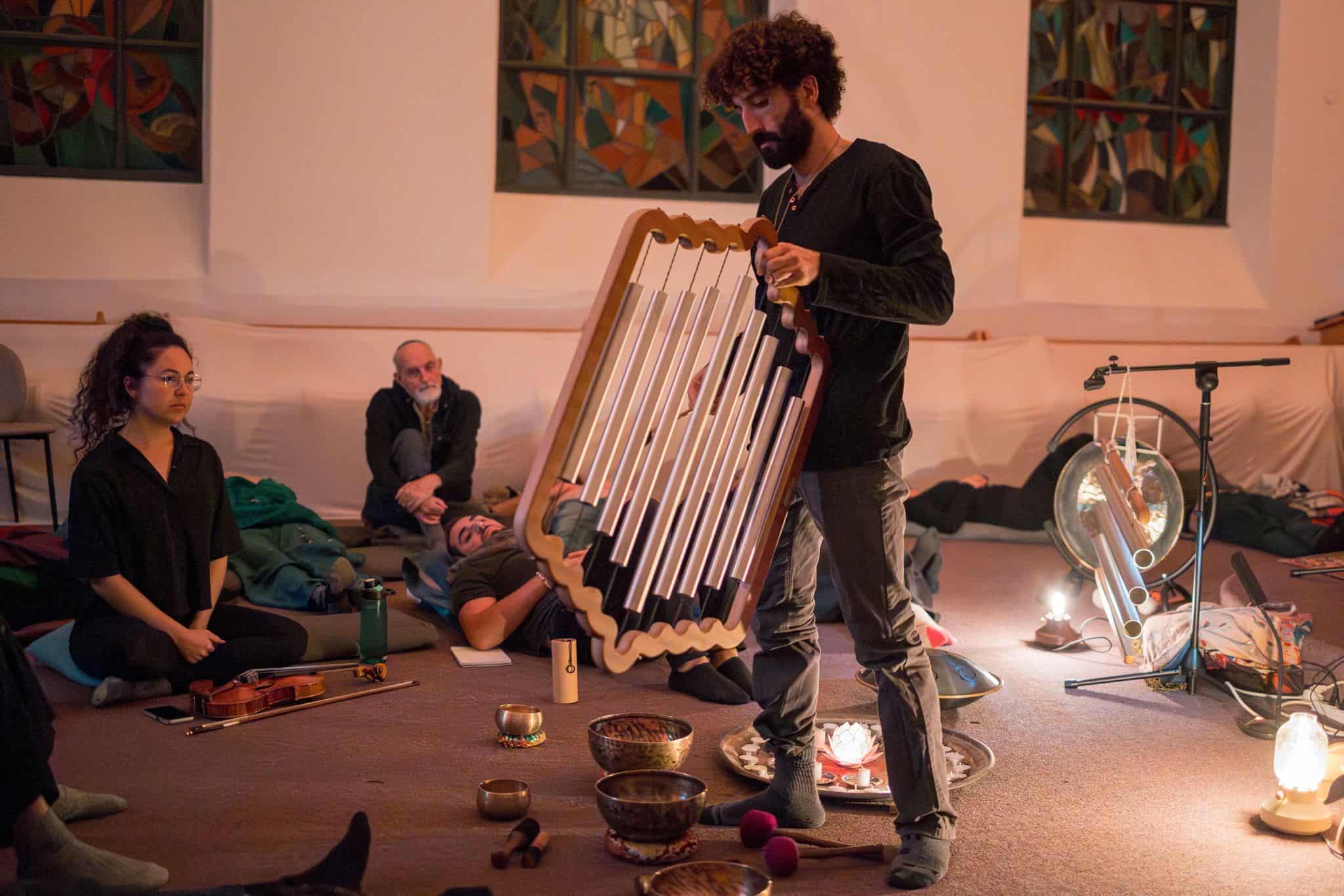 : שימוש בכלי נגינה ממגוון תרבויות המאפשרים למשתתף להרפות לתוך עצמו ולהתמסר למסע של צלילים וויברציות אשר יגעו בו הן מבחינה פיזית – יאטו את גלי המוח יגרו את המערכת הפרה סימפטטית לכדי מצב של רגיעה וריפוי בין שינה לעירות. והן מבחינה נפשית יאפשרו את שחרור האחיזה בזמן ובמרחב לכדי מרחב של חלימה ודמיון בשל היותם עוקפים את השכל והלוגיקה ונוגעים ישר בלב ובאינטואציה הפנימית.