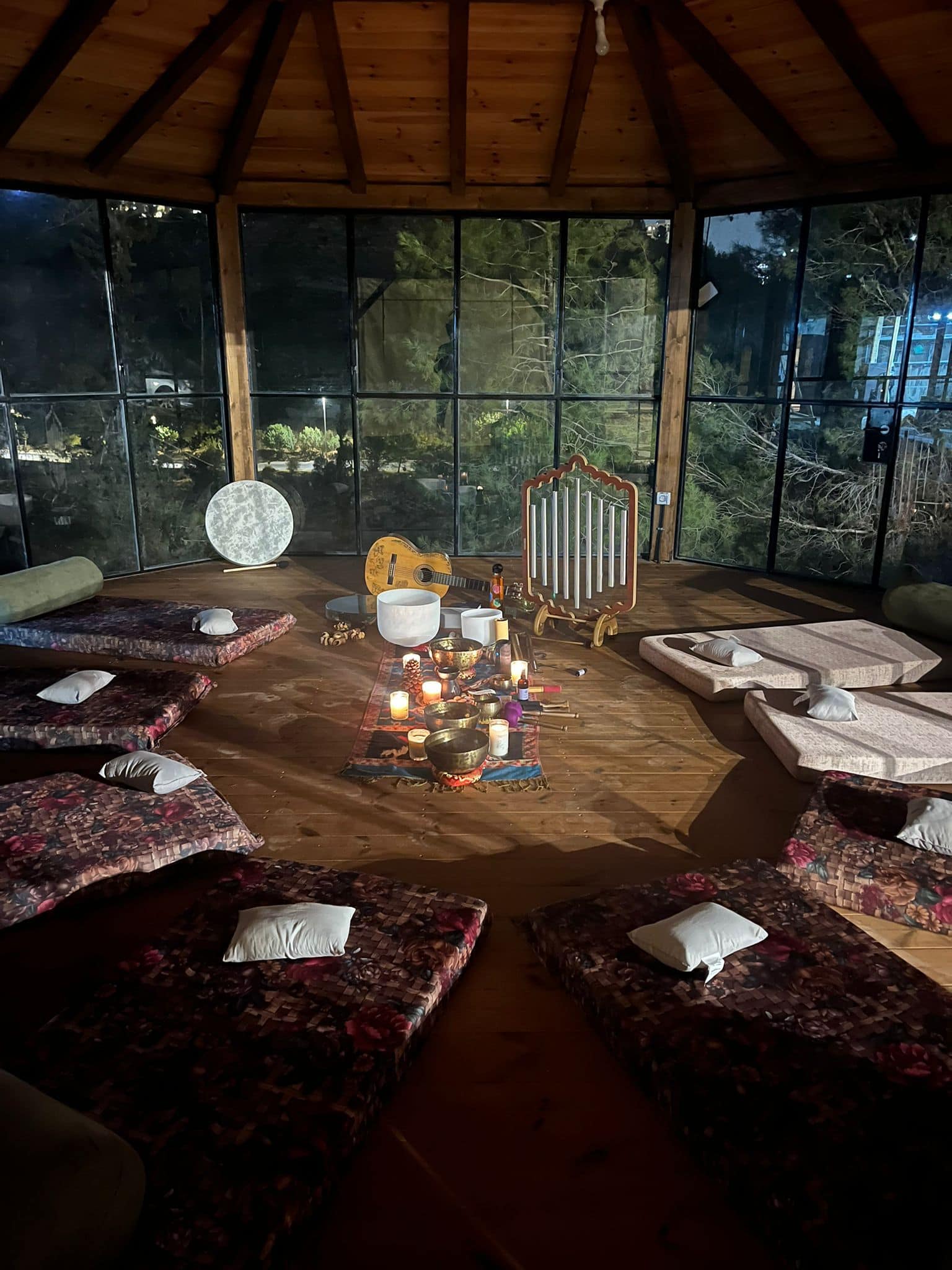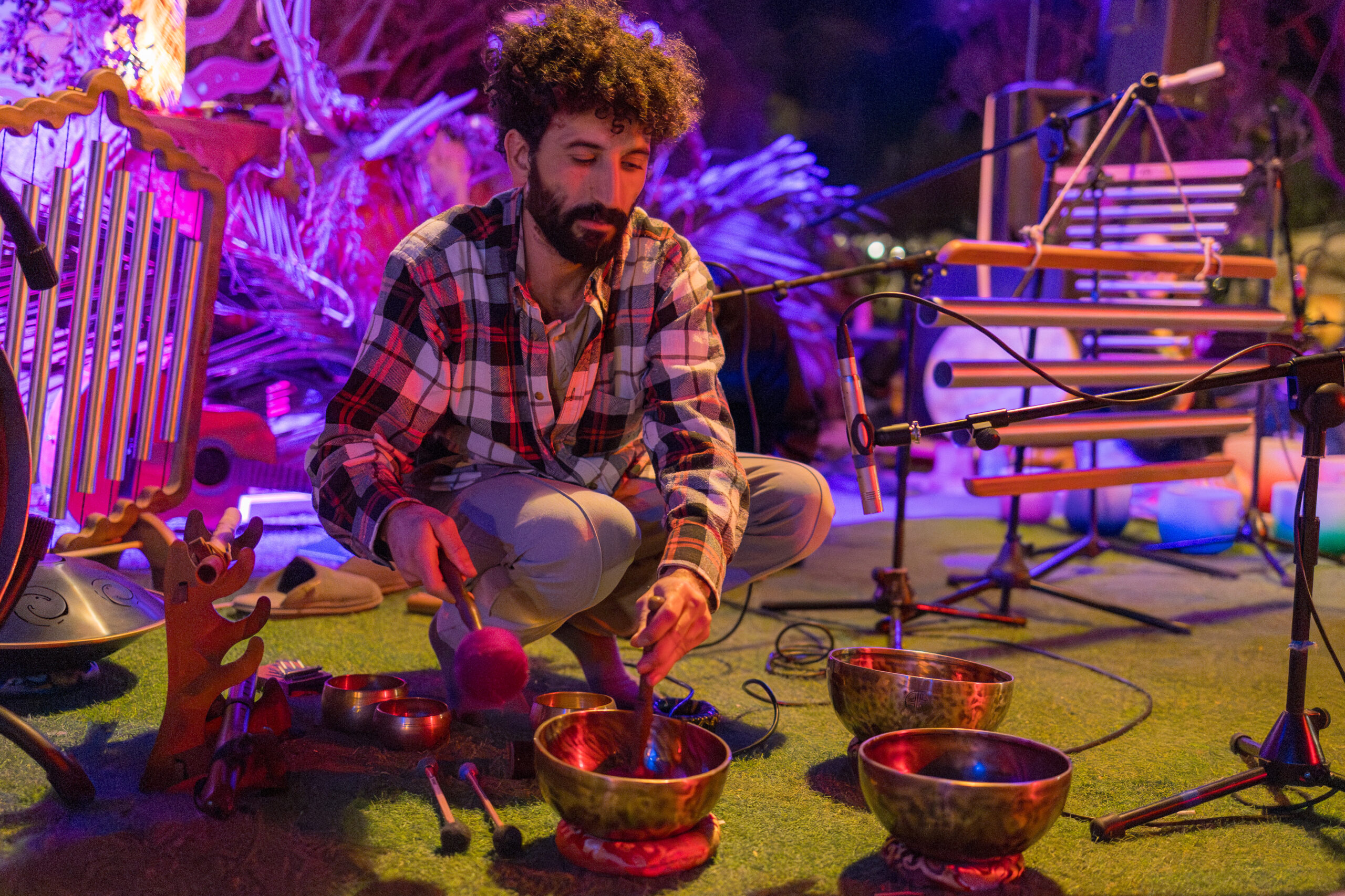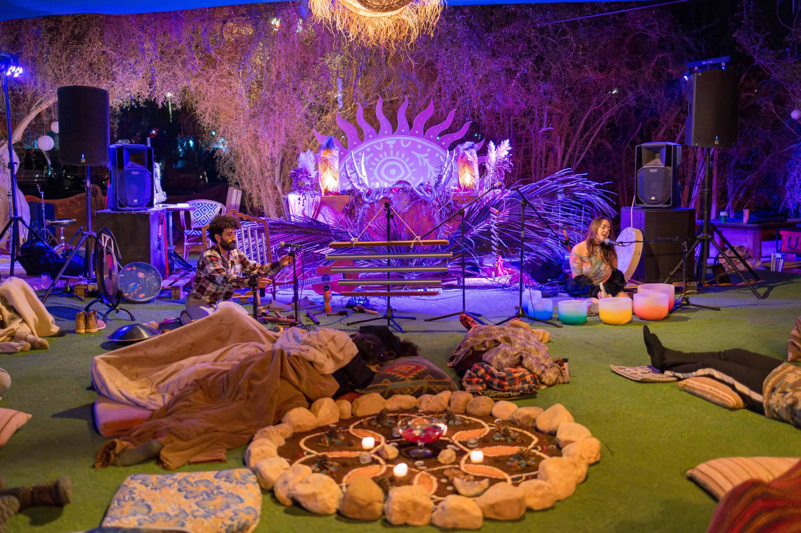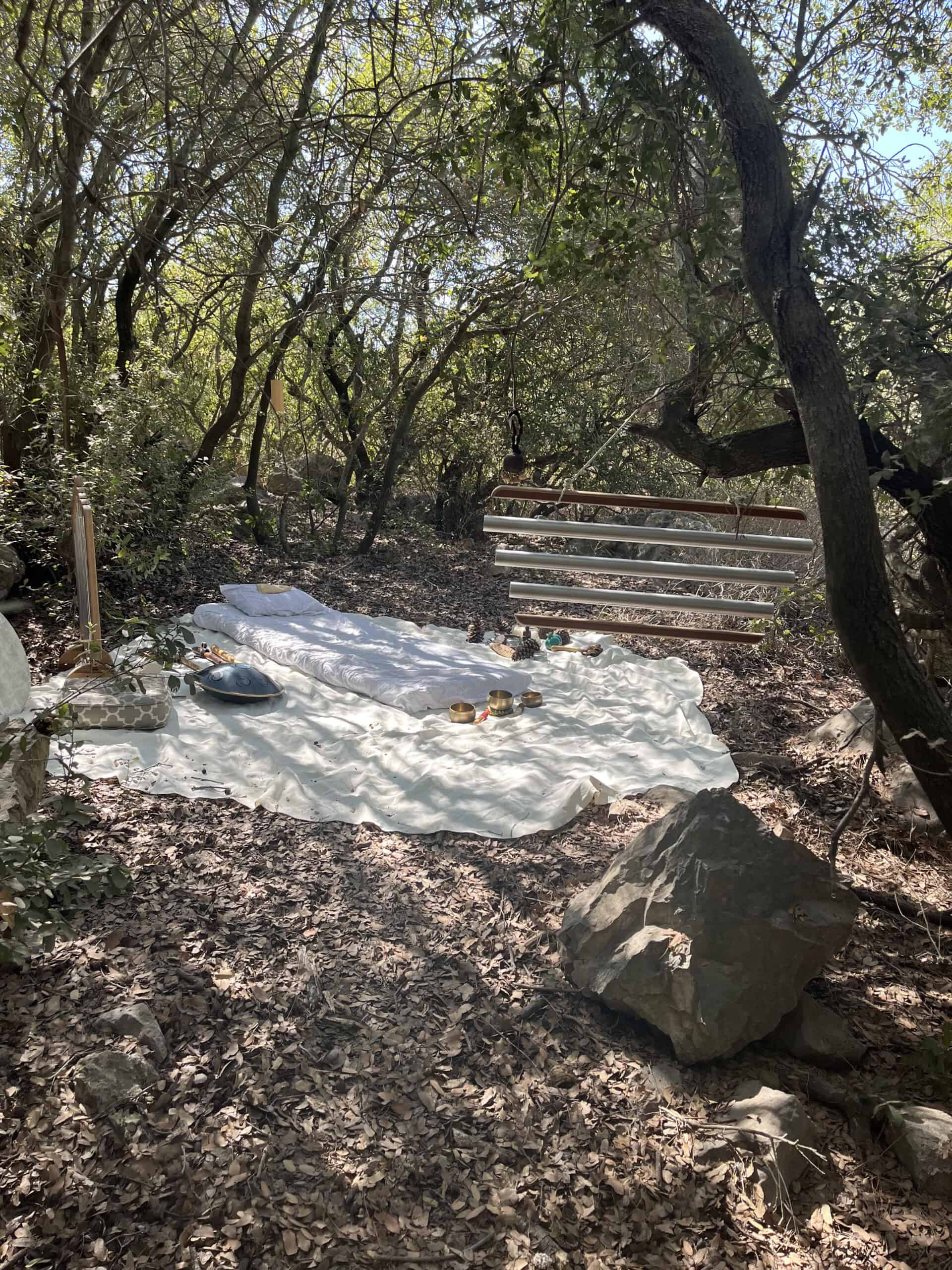 : שימוש בכלי נגינה ממגוון תרבויות המאפשרים למשתתף להרפות לתוך עצמו ולהתמסר למסע של צלילים וויברציות אשר יגעו בו הן מבחינה פיזית – יאטו את גלי המוח יגרו את המערכת הפרה סימפטטית לכדי מצב של רגיעה וריפוי בין שינה לעירות. והן מבחינה נפשית יאפשרו את שחרור האחיזה בזמן ובמרחב לכדי מרחב של חלימה ודמיון בשל היותם עוקפים את השכל והלוגיקה ונוגעים ישר בלב ובאינטואציה הפנימית.